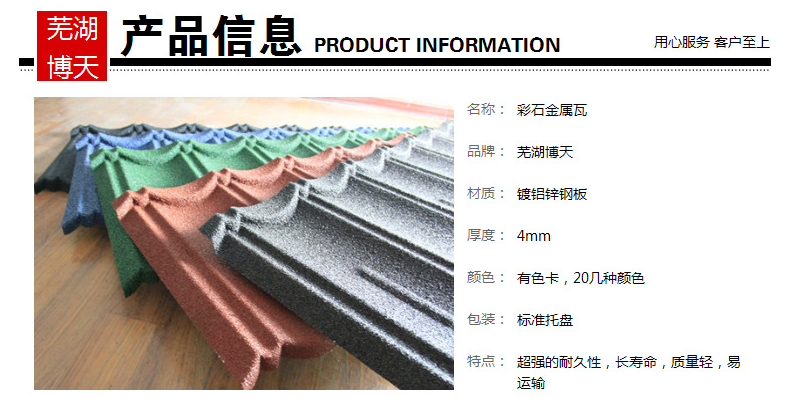 (1)基材:鍍鋁鋅鋼板 鍍鋁鋅鋼板的選擇對彩石金屬瓦的使用年限影響很大,博天牌彩石金屬瓦選擇時一般采用金色耐指紋保護膜,鍍鋅含量至少達到80克,板厚至少0.4mm,表層能明顯感覺到光滑面和鋅花,這樣瓦片不易生銹。